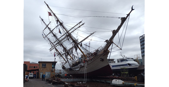The famous Europa tall-ship, which capsized while undergoing maintenance at Cape Town Port, has been stabilised but has yet to be restored to an upright position.
